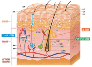 人間には「エクリン汗腺」と「アポクリン汗腺」という 2種類の汗腺があります。 ボトックスをワキに注射すると、エクリン汗腺から 分泌される汗の量を減らすことが可能です。 また、臭いのあるアポクリン汗腺からの 汗も抑える作用があります。