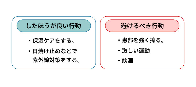 ダウンタイム中は、保湿を行い、施術部分を強くこすらず、日焼けに注意し、激しい運動や飲酒は控えましょう。特にかさぶたを無理にはがすのは避けてください。