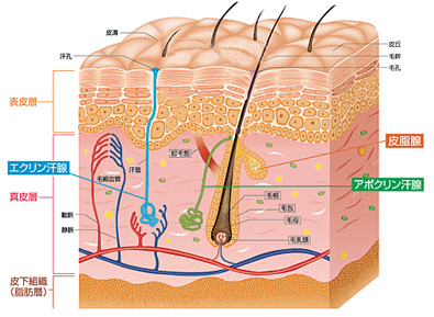 エクリン汗腺、アポクリン汗腺からの汗の分泌が抑制されます。エクリン汗腺からの汗の分泌が減少することで多汗症の改善に効果があります。