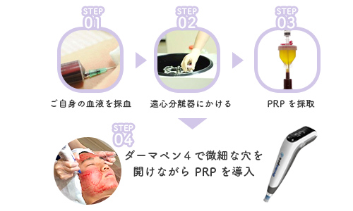 プレステージPRP(血小板療法)とは、自分の血液を採取して特殊な機器で血液から血小板(傷を治す成分)を濃縮して取り出す、美容医療でも新しい治療法です。血小板を高濃度に含んだPRP液をシワや凹んだ部位に注入し、その部分を再生する働きを利用します。