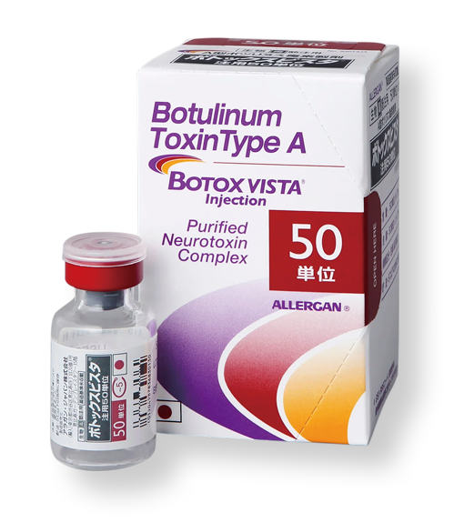 ボトックスビスタ®はアメリカのアラガン社が開発した、眼瞼痙攣、片側顔面痙攣などの治療にも使用されているA型ボツリヌス毒素製剤です。日本の厚生労働省やアメリカのFDA(食品医薬品局)から認可を得ている薬剤で、有効性・安全性が確認されています。