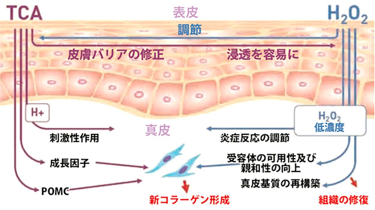 コラーゲンピールとはPRX-T33という薬剤を使用し、従来のピーリングのように皮膚を剥離させて再生を促進するのではなく、トリクロロ酢酸(TCA)という成分が真皮深層まで浸透してコラーゲンの生成を促進し、肌の再生を活性化させる治療法です。