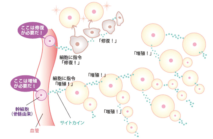 増殖が必要な細胞には”増殖に関わるサイトカイン”を、修復が必要な細胞には”修復に関わるサイトカイン”を使って、細胞が正常な状態を保てるよう働きかけます。