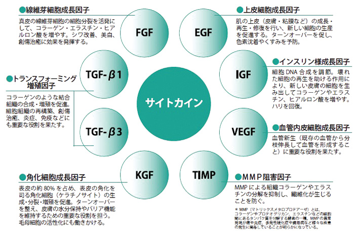サイトプロには、その中でも特にスキンケアに効果的なサイトカイン72 種類を配合。その一部を紹介します。