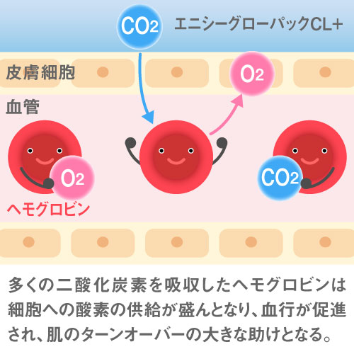 そこでエニシーグローパックCL+が肌表面に密着し、炭酸ガス(CO2)が毛細血管へと送り込まれることから「ヘモグロビンが運ぶ酸素」と「炭酸ガスに含まれる二酸化炭素」との交換作業である「ボーア効果」が活発になるのです。