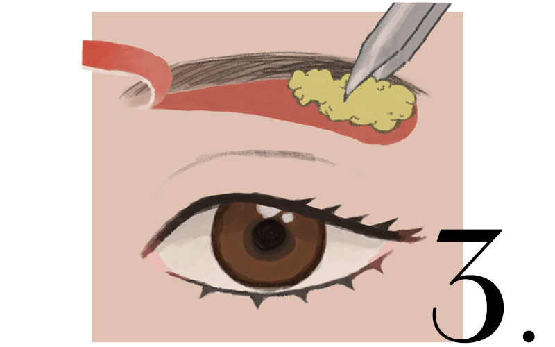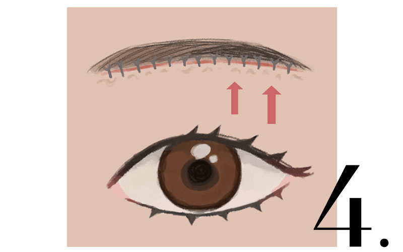 眉毛の生え際に沿って皮膚だけでなく組織も丁寧に縫合していきます。