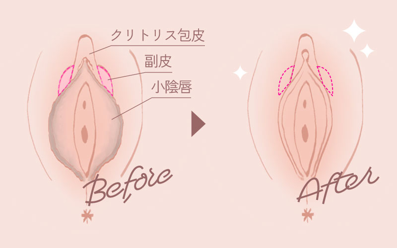 副皮があるからといって必ず手術が必要とは限りませんが、大陰唇と小陰唇の間にあるため汚れが溜まりやすく、ニオイや痒みなど炎症が起きやすい原因の1つです。また副皮の切除だけでなく、小陰唇縮小術やクリトリス包茎術の際、バランスを整えるために一緒に施術を受ける方も多くいます。
