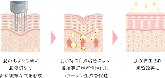 表皮に空いた細かな穴が閉じるまでの間に、肌の再生能力の働きによりコラーゲンの生成が促され、成長因子や様々な美容成分を肌の奥まで届けます。