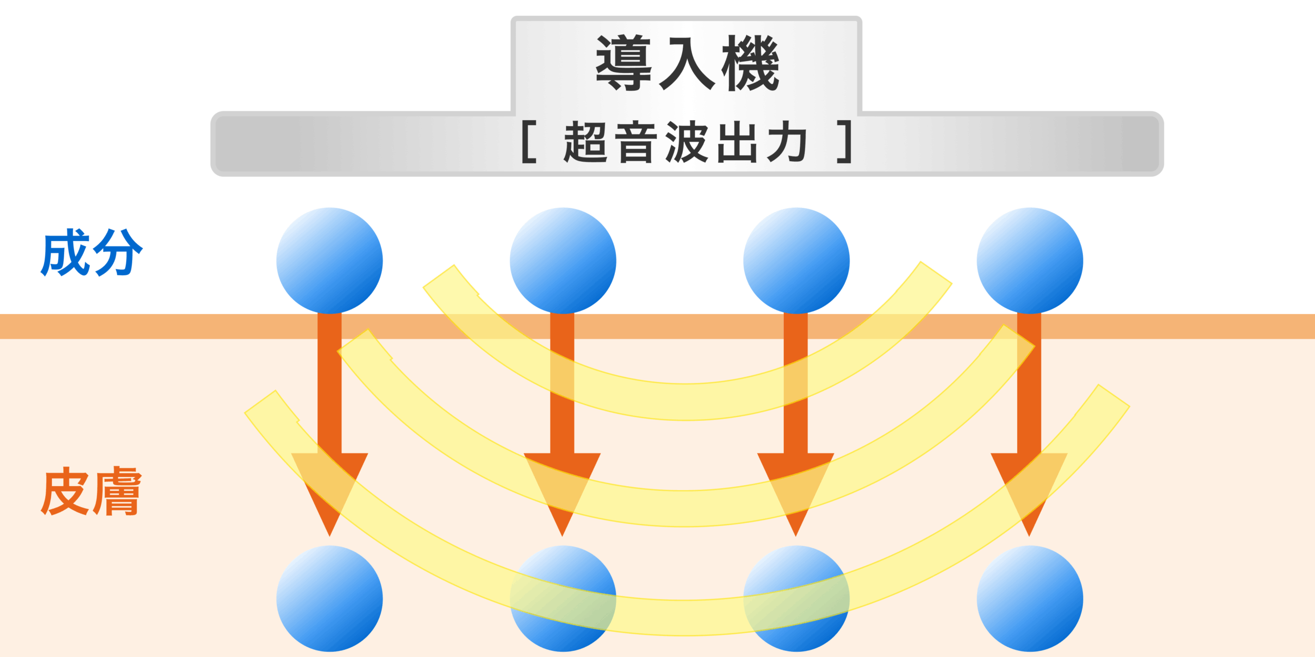 ソノフォレーシスとは、音波の振動により角質層のバリアにキャビテーション現象(空洞形成)を起こし、その空洞内に物質を移動させることを言います。そうすることで比較的大きな分子量のものでも浸透しやすくなります。ソノフォレーシスを使用すると有効成分の浸透はただ塗るだけより約40〜100倍高まることが分かってきています。