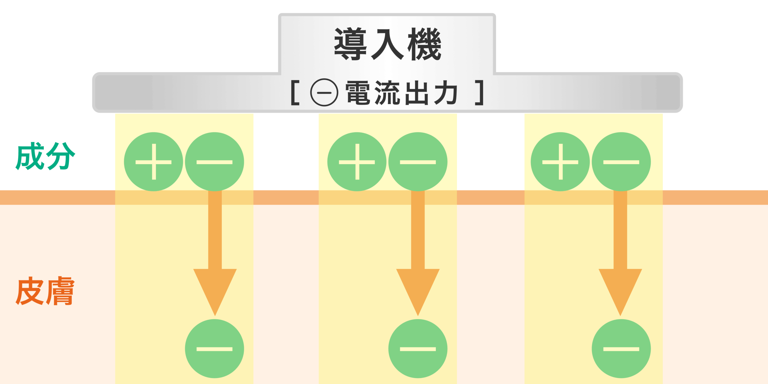 イオン導入・超音波導入とは、ビタミンC・ビタミンAなどの有効成分を豊富に配合したトリートメント剤をお肌に塗って、微弱な電流や超音波を流すことでより肌の深部まで浸透させる施術法です。肌表面にあるバリア機能を通り抜けて有効成分をお肌に届け、シミ・シワ・たるみ・ニキビ・ニキビ跡などの肌トラブルを改善します。