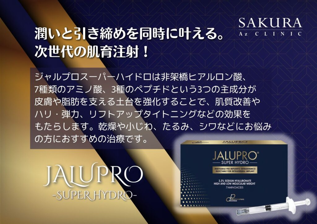 ジャルプロ注射 スーパーハイドロによる肌育ケアメニュー。乾燥やハリ不足が気になる方へ、肌全体のコンディションを整えたい方向けの施術です。