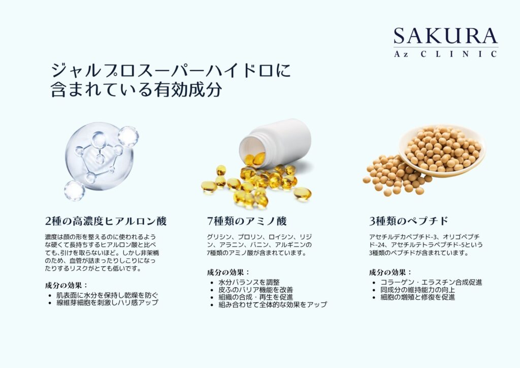 ジャルプロスーパーハイドロは、アミノ酸、ペプチド、高分子・低分子のヒアルロン酸を組み合わせた注入製剤です。肌表面にうるおいを与えるだけではなく、肌を支える深部の結合組織や、顔の印象を支える土台に着目して設計されているのが特徴です。