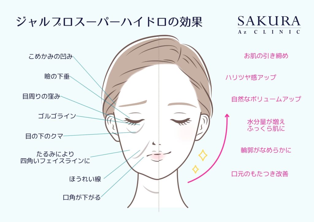 一般的なヒアルロン酸注入のように、くぼみをその場で持ち上げたり、輪郭をはっきり作ったりする治療とは少し考え方が異なります。ジャルプロスーパーハイドロは、肌の状態を整えながら、全体の印象を自然に上向かせていくようなイメージで受けていただきやすい施術です。