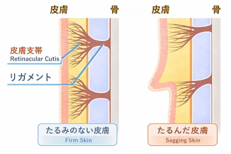 リガメントとは、顔の皮膚と骨をつなぎ、皮膚や脂肪を支える土台のような役割を担う組織です。さらに、皮膚側には「皮膚支帯(Retinacular Cutis:RC)」と呼ばれる細かな線維状の組織が広がっており、木の枝のように皮下組織の中を張り巡らすことで、肌を支えています。