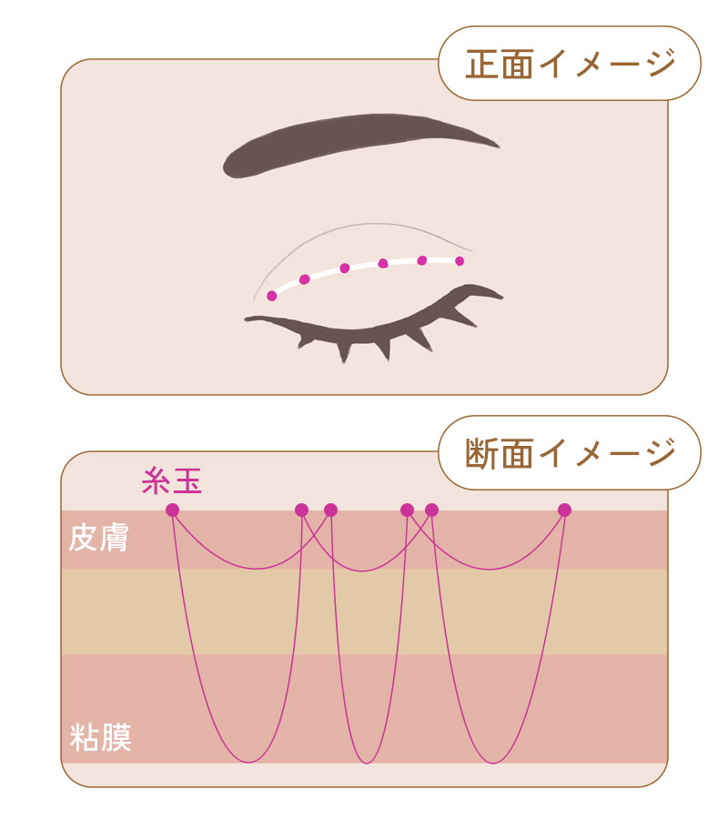 まぶたの皮膚と結膜の裏にある瞼板(軟骨)を結びつける方法です。まぶたの裏側に糸が露出するため、稀に角膜に傷がつくリスクがあります。