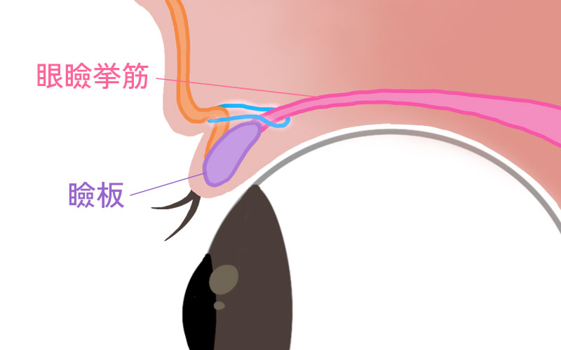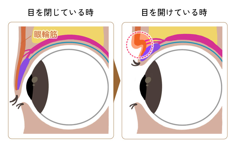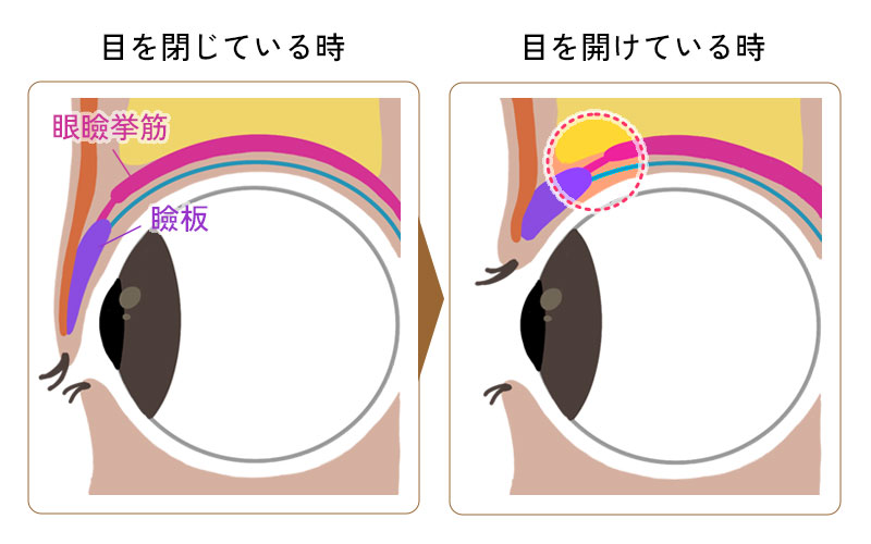 眼瞼挙筋が枝分かれして瞼板や眼輪筋にくっついているため、目を開くと筋肉も持ち上げられ皮膚がたたまれることで二重がつくられる