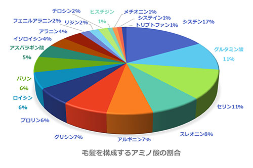 髪の毛は主にケラチンというタンパク質からできていて、そのタンパク質は20種類のアミノ酸から構成されています。
