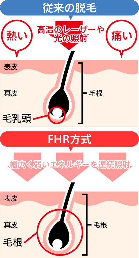従来の医療脱毛と全く違う、毛包全体にエネルギーを蓄積させる全く新しい脱毛方法です。 従来の脱毛は毛根のメラニン色素をターゲットにして強いレーザーを照射するため、毛根の太い男性の場合、強い痛みや火傷のリスクが高いものでした。畜熱式医療脱毛は、この問題を全面的に解決する全く新しい脱毛メカニズム「FHR (flexible Hair Removal )方式」を採用。