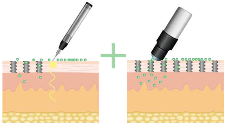 エレクトロポレーションとは、ペン型のプローブで特殊な電気パルスを皮膚に当てて、細胞の間に一時的にスキマをつくることを指します。そこにローラー型のプローブで電気による反発力・浸透力・物理的押力を利用して大量の有効成分を流し込みます。