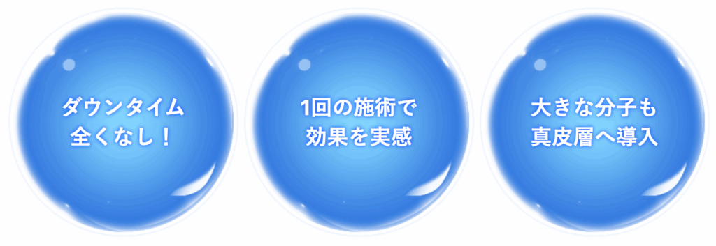 美容成分が浸透した肌は施術直後からトーンが均一になり、ハリを実感することができます。他にもシミや小じわ、くすみなどのエイジングサインを解消したり、毛穴を引き締めキメのあるツヤ肌に導いてくれます。