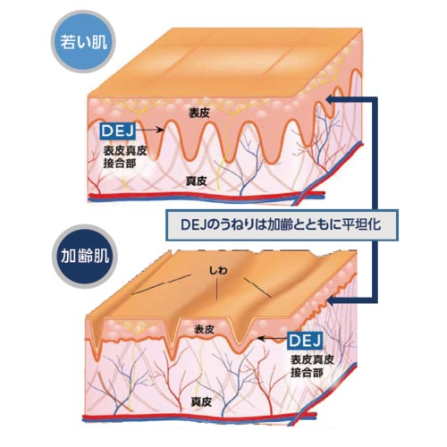 このDEJには重要な構造体が存在しており、若い肌ではこの境界部分は波形に大きくうねっていますが、加齢とともにたんぱく質が減少してくると萎縮し、この境界部分の波型のうねりが小さく平坦になってきます。この現象により皮膚がゆるむことで、たるみにつながります。このことからDEJを健康に保つことは健康な肌をキープする鍵となるのです。