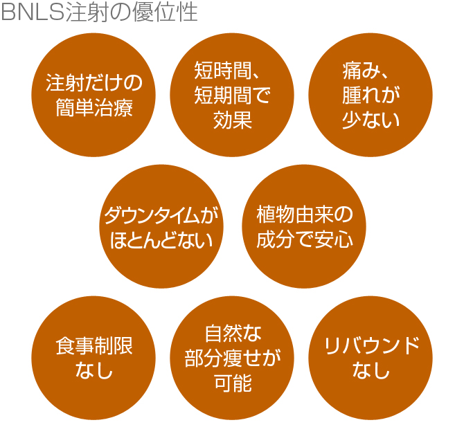 顔にも使用することを考えてつくられたBNLSneo注射は、従来の脂肪融解注射で起きていた、術後の腫れや筋肉痛のような痛みがなく、さらに植物由来成分を主成分としているためダウンタイム・副作用がほとんどありません。
