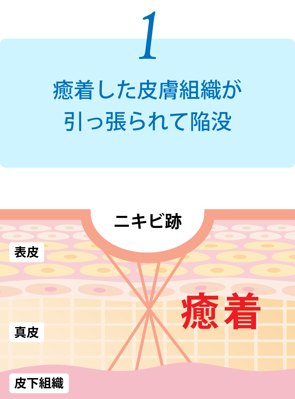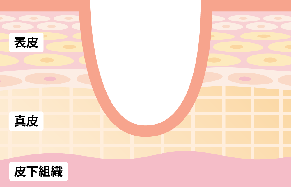 クレーターの直径が3~5mm以上と大きく、緩やかにくぼんでいるのが特徴です。炎症により線維化した組織が真皮から筋膜にかけて癒着し、皮膚が下に引きつられている状態です。