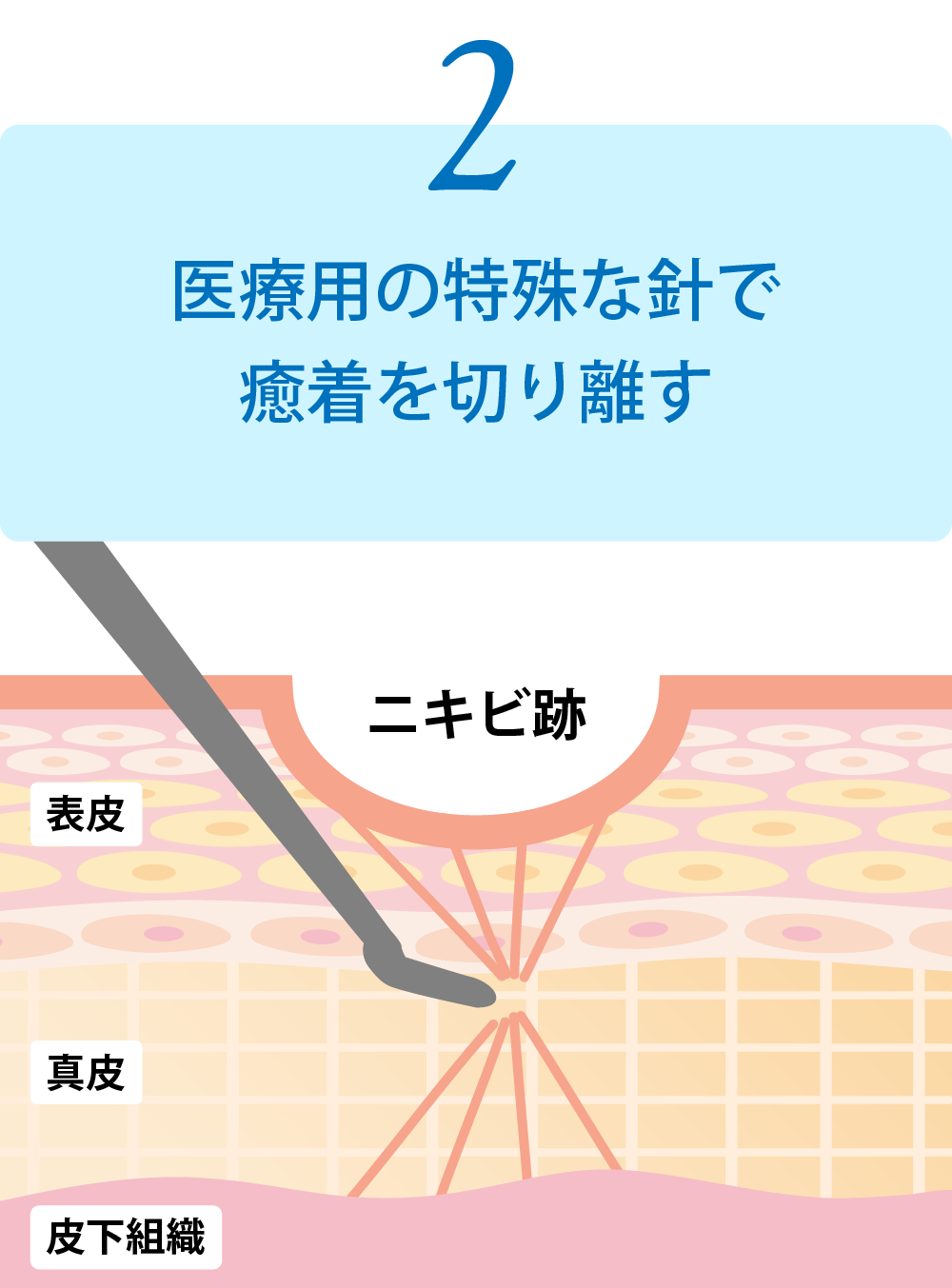 クレーターのように凹んでしまったニキビ跡の下には、固く線維化してしまった組織が癒着しています。この癒着を専用の針で切断することによって陥没を改善し凹凸のない元の皮膚状態に導きます。