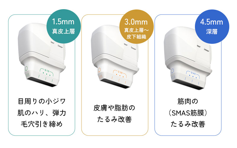 ウルトラセルQ+とは、HIFUと呼ばれる超音波エネルギーを真皮~深層の3層にアプローチすることによってたるみを引き上げるリフトアップマシンです。皮膚を切らないため、短時間かつ痛みの少ない施術が可能でダウンタイムもほとんどありません。また肌の深層部にあるSMAS筋膜まで熱エネルギーを届けるため、皮膚の内側からしっかりと引き締めることができます。