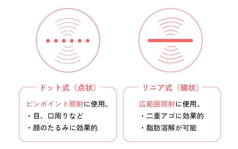 痛み | 肌に赤みやほてりが出る場合がある | 熱量が大きい分、痛みも強い | 熱エネルギーが分散され、痛みが少ない | 痛みが少ない分、効果の持続期間は短い |